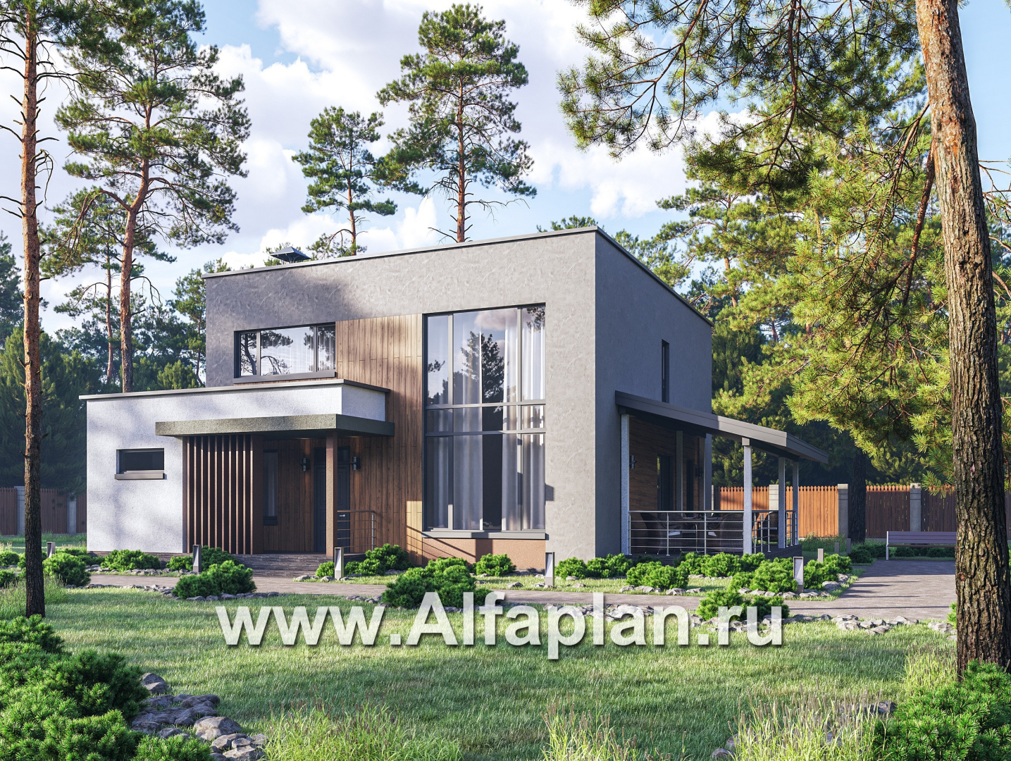 «Коронадо» - проект дома, 2 этажа, со вторым светом гостиной, с террасой и плоской крышей, в стиле хай-тек