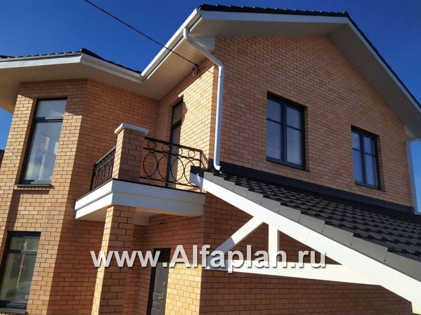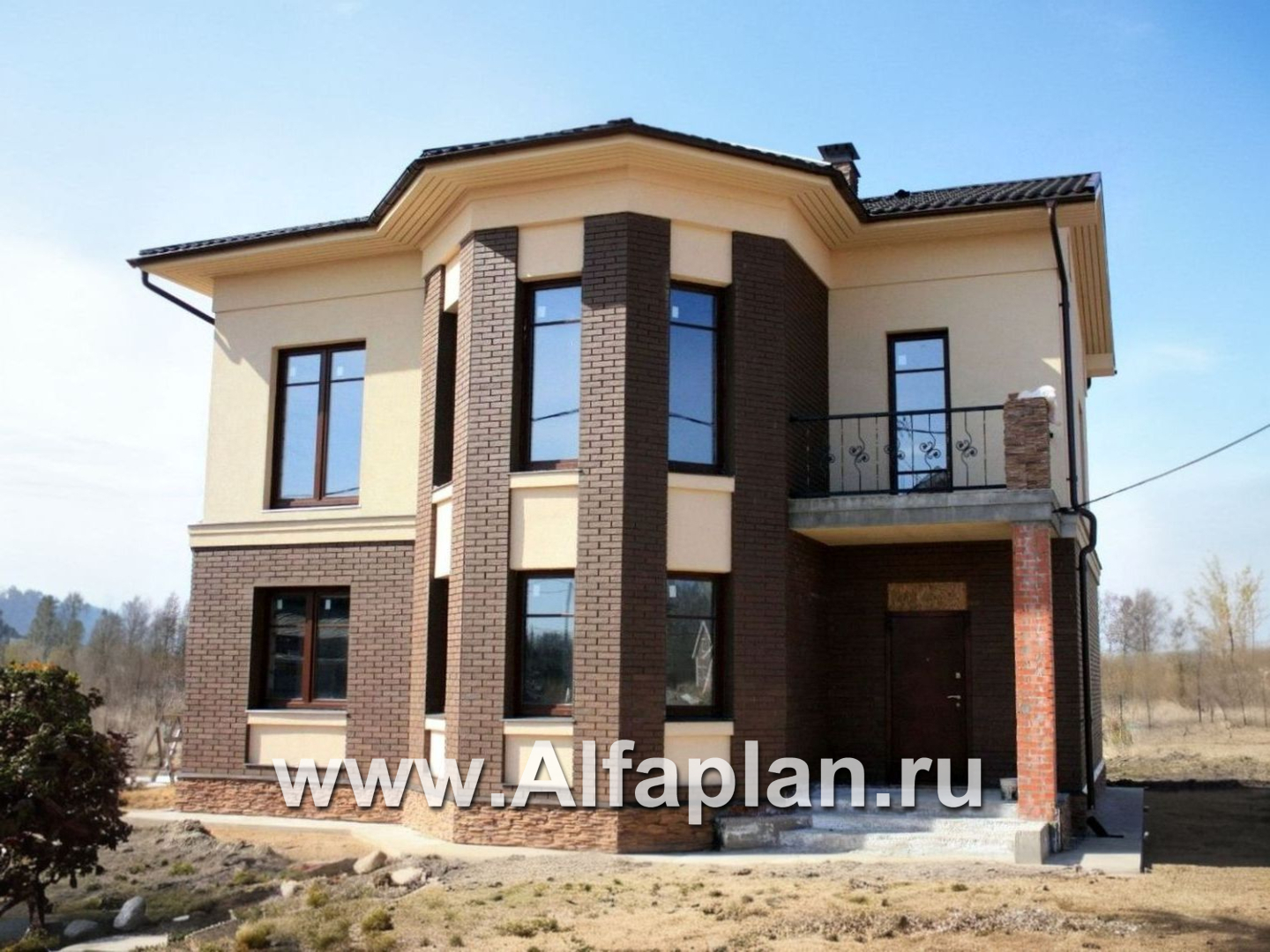 Красивый двухуровневый коттедж, в архитектуре которого присутствуют все популярные детали загородного дома: эркеры, гараж для машины, балкон и уютная терраса. Самый заметный элемент, конечно же, двухэтажный эркер. Он оживляет центральный фасад, подчеркивает облик здания, делая его оригинальнее и выразительнее.