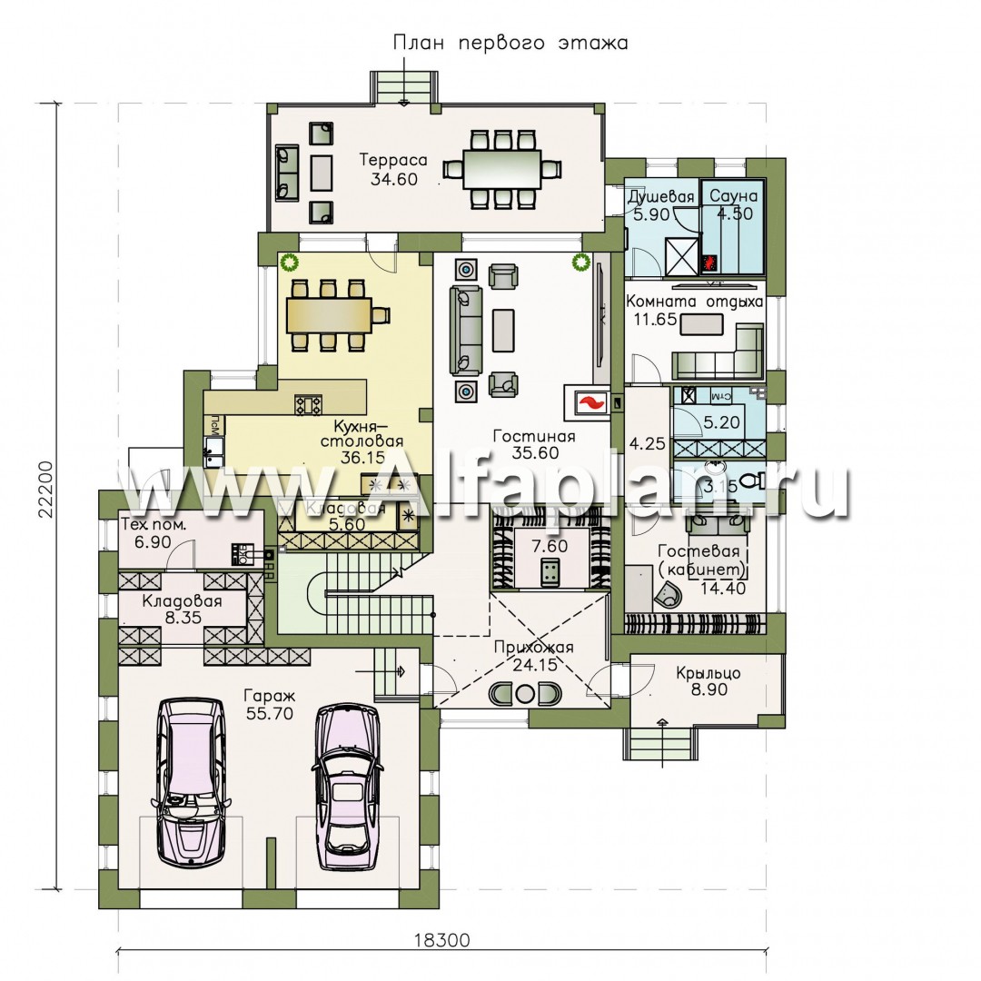 « Альстер» — проект двухэтажного дома в стиле хай-тек, элитая вилла, навес на 2 авто - технические характеристики