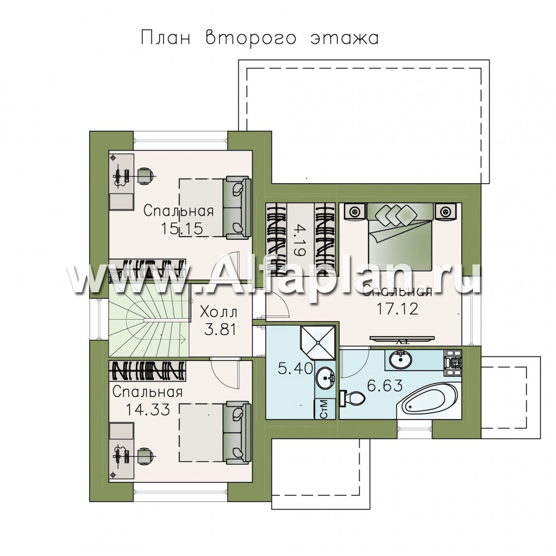 Поднимаемся по лестнице и попадаем на второй этаж с 3 спальнями. Спальня площадью 17 м² дополнена удобной 4-метровой гардеробной и оснащена выходом к 6-метровому санузлу с ванной. На этаже находятся 15-метровая и 14-метровая спальни, расположенные друг напротив друга, и санузел площадью 5 м².