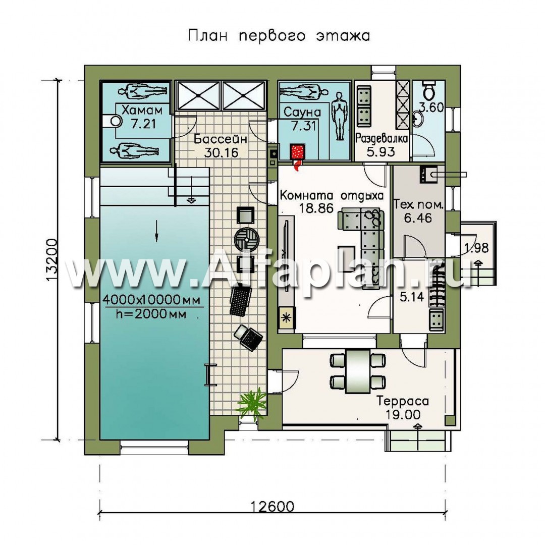 подвального этажа в проекте нет. Проект разноуровневый, т.к. чаша бассейна находится ниже уровня пола первого этажа. Проект разработан в объеме архитектурно-строительных чертежей, в состав которых входят поэтажные планы, фасады, разрезы, фундамент, перекрытия, стропильная конструкция, узлы, детали, спецификация материалов. Инженерия (в т.ч. для бассейна) не входит в состав проекта.