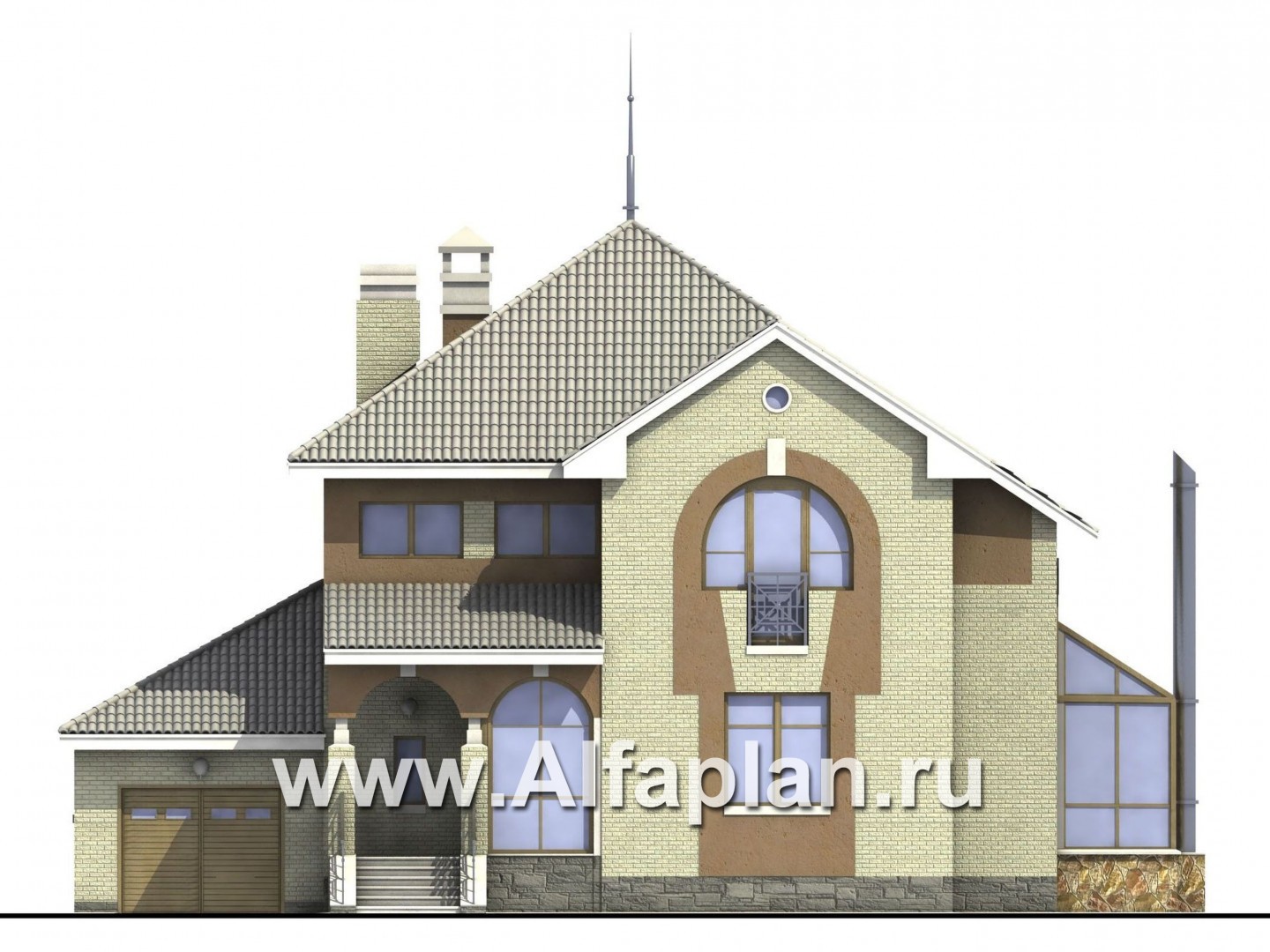 Отличительной особенностью внешнего вида данного коттеджа является массивный, двухэтажный эркер главного фасада. Эркер заведен под общую крышу, что придает дому надежный и презентабельный вид. Вход в дом оформлен двумя массивными колоннами и выполнен в виде арок, что отлично сочетается с закругленными окнами.