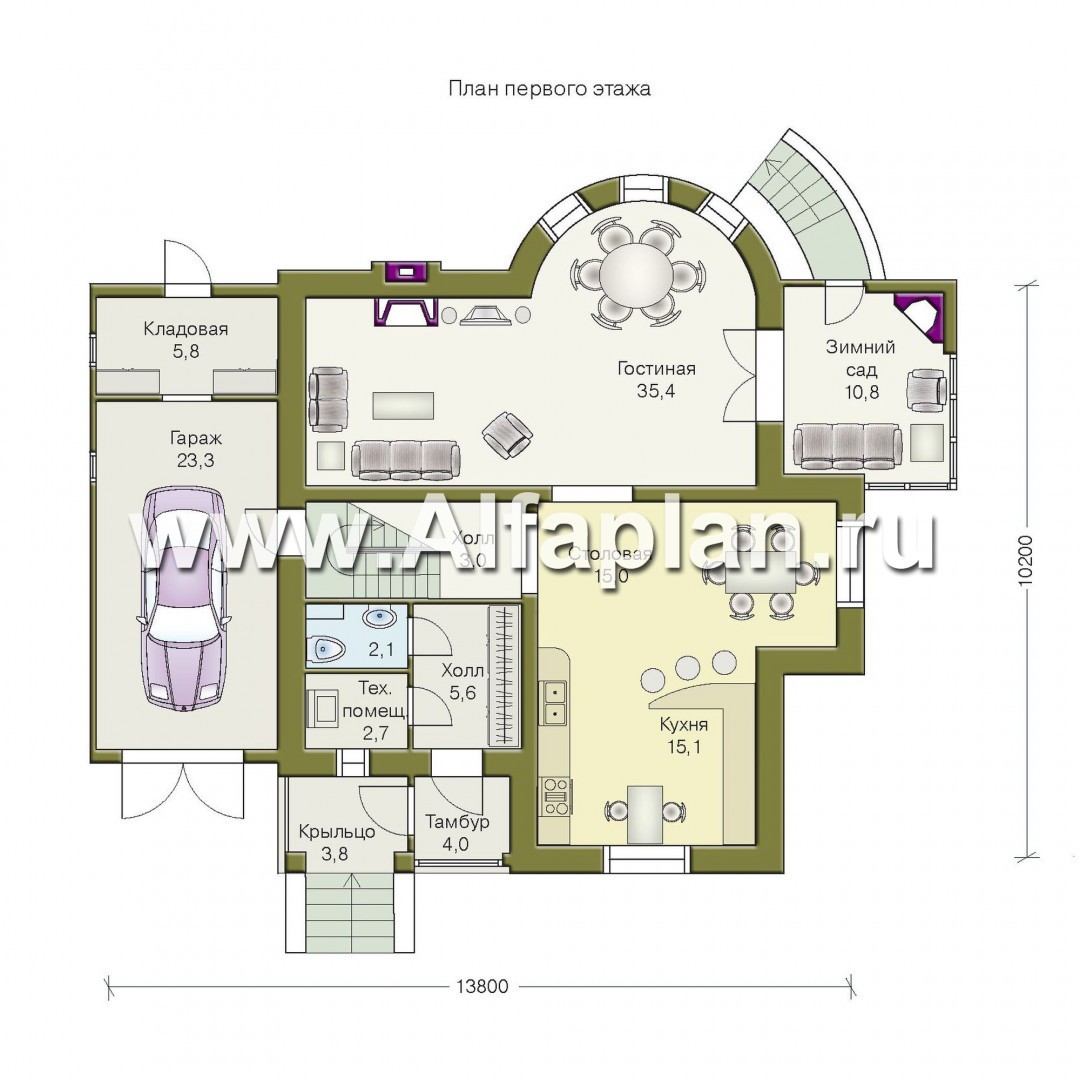 Входной блок коттеджа включает в себя крыльцо, тамбур, прихожую и холл. Из холла первого этажа можно попасть в любое помещение дома. Холл плавно перетекает в двусветное пространство столовой. К столовой примыкает кухня. Кухня полностью расположена в пространстве, образованном квадратным эркер. Кухня-столовая и гостиная соединяются арочным проемом. В гостиной выделена зона отдыха с камином. Эта комната занимает на первом этаже наибольшую площадь. Из гостиной есть вход в застекленный зимний сад, из которого предусмотрен второй вход в дом. Также в дом можно попасть через кладовую гаража. Кладовая и гараж расположены с противоположной от зимнего сада стороны дома. Рядом с лестницей, ведущей на второй этаж, находится техническое помещение и туалет. На втором этаже традиционно располагаются личные апартаменты владельцев. Из холла второго этажа открывается вид с балкона в столовую. В одной из спален предусмотрен французский балкон, во второй - выход на балкон над эркером гостиной. На втором этаже по плану размещены две ванные комнаты, имеющие смежную стену и отдельные входы: один - из спальни, другой – из холла. При необходимости меньшую ванную комнату можно заменить на кладовую.Удобная планировка в сочетании с элегантностью внешнего вида дома обеспечит максимально комфортные условия для проживания.