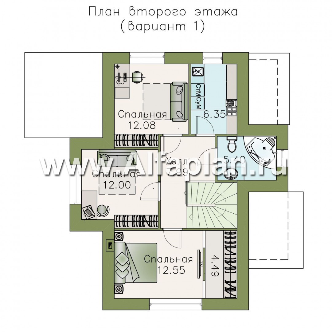 Пространство второго этажа по традиции отдано под помещения приватной группы. Это три спальни, две из которых сопоставимы по площади. Третья, родительская, оборудована собственным помещением под гардеробную. Кроме того, на этаже, согласно проекту дома из газобетона (кирпича), нашлось место для служебного помещения, в котором можно оборудовать постирочную. Предусмотрен и второй вариант проекта, согласно которому площадь гостевого санузла расширяется за счет постирочной и части холла.