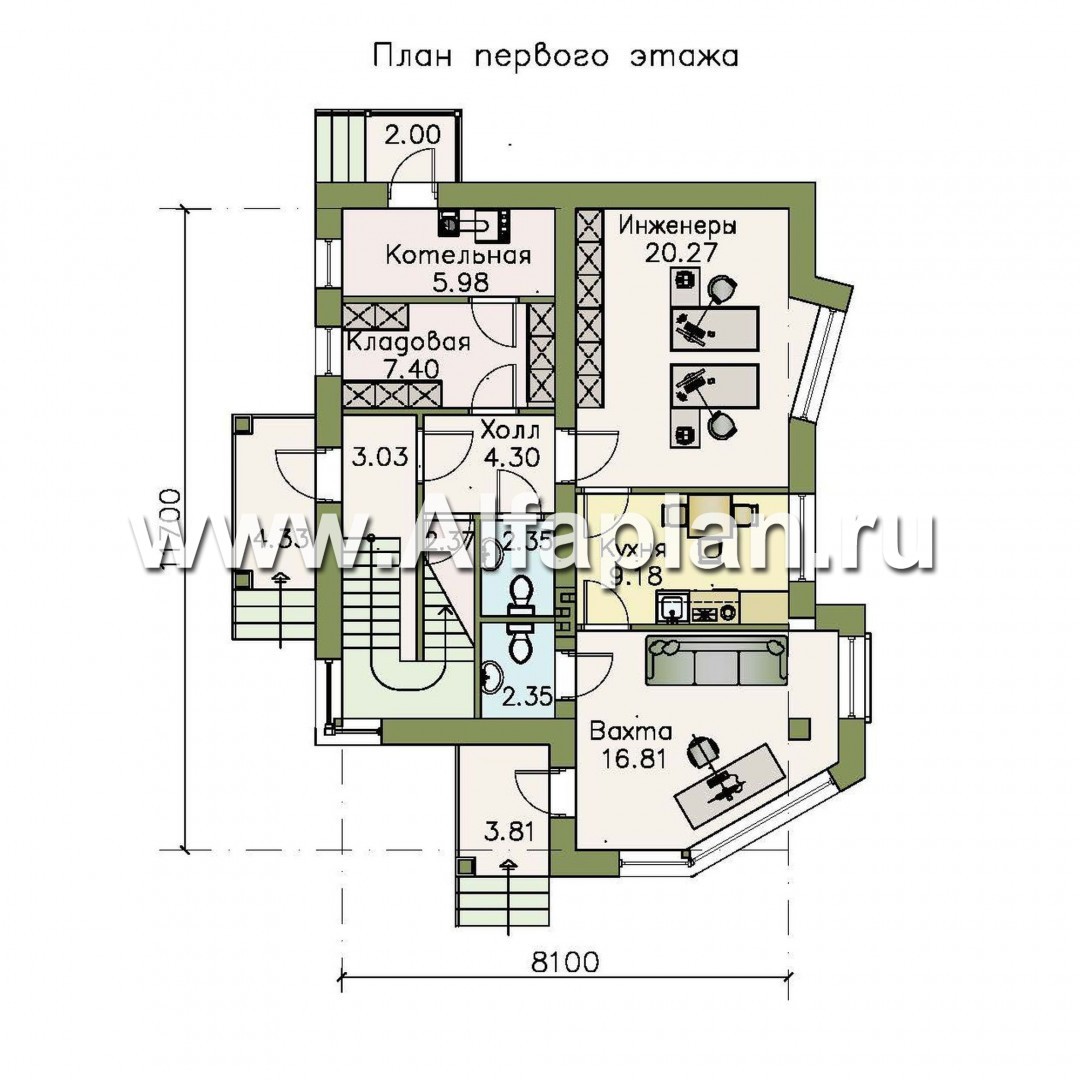 Просторное вахтенное помещение отделено от кабинетов специалистов. Визиты посетителей не создадут помехой для рабочего процесса. На первом этаже находится просторный кабинет для инженеров, котельная для автономного отопления, кладовая, в которой можно хранить рабочие инструменты, оборудование. В доме есть кухня, обеспечивающая комфортные условия для приготовления, приема пищи. Наличие двух санузлов создает удобство для сотрудников обоих полов.