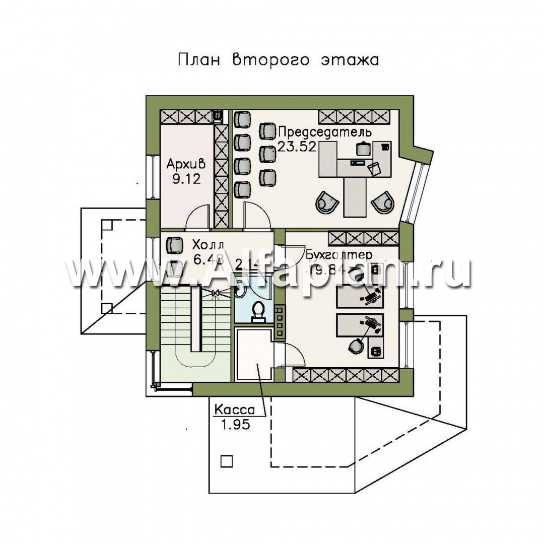 Основную площадь второго этажа занимают два просторных кабинета. Одно помещение предназначено для руководителя, оборудовано большим панорамным окном для хорошего естественного освещения. Солидная площадь позволяет оборудовать удобное рабочее место, зону для переговоров. Второй кабинет предназначен для бухгалтерии. Есть отдельное помещение для кассы, которое позволяет создать надежную систему защиты. На втором этаже – архив и санузел.