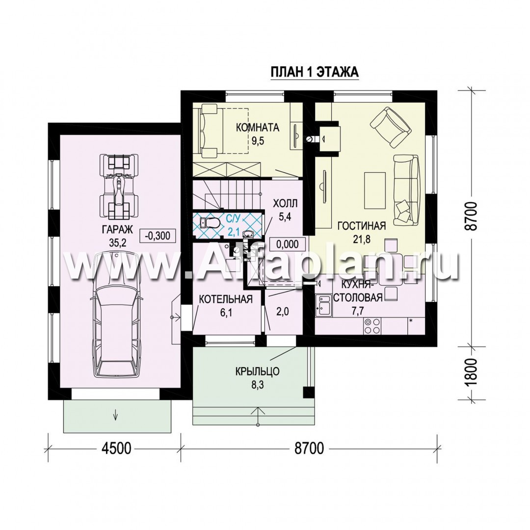 Проект двухэтажного дома из газобетона, планировка с кабинетом на 1 эт и с террасой, с гаражом на 1 авто