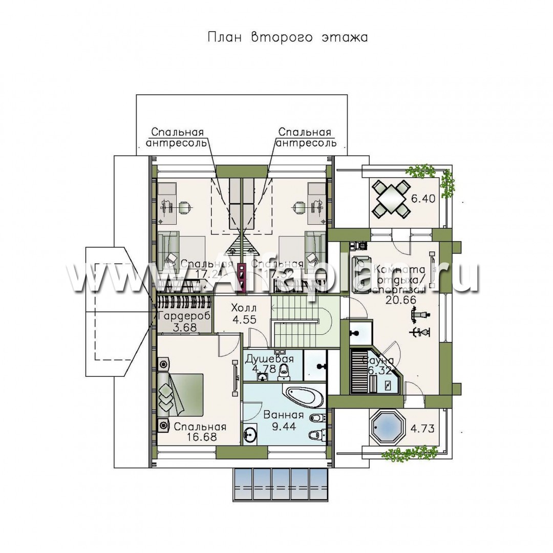 Жилая часть второго этажа отдана под помещения приватной зоны. Проектом дома из кирпича (газобетона) предусмотрено три спальни, две из которых оборудованы антресолями. Третья является изолированной и снабжена собственным санузлом. Все помещения, включая общую душевую, сгруппированы вокруг небольшого холла.