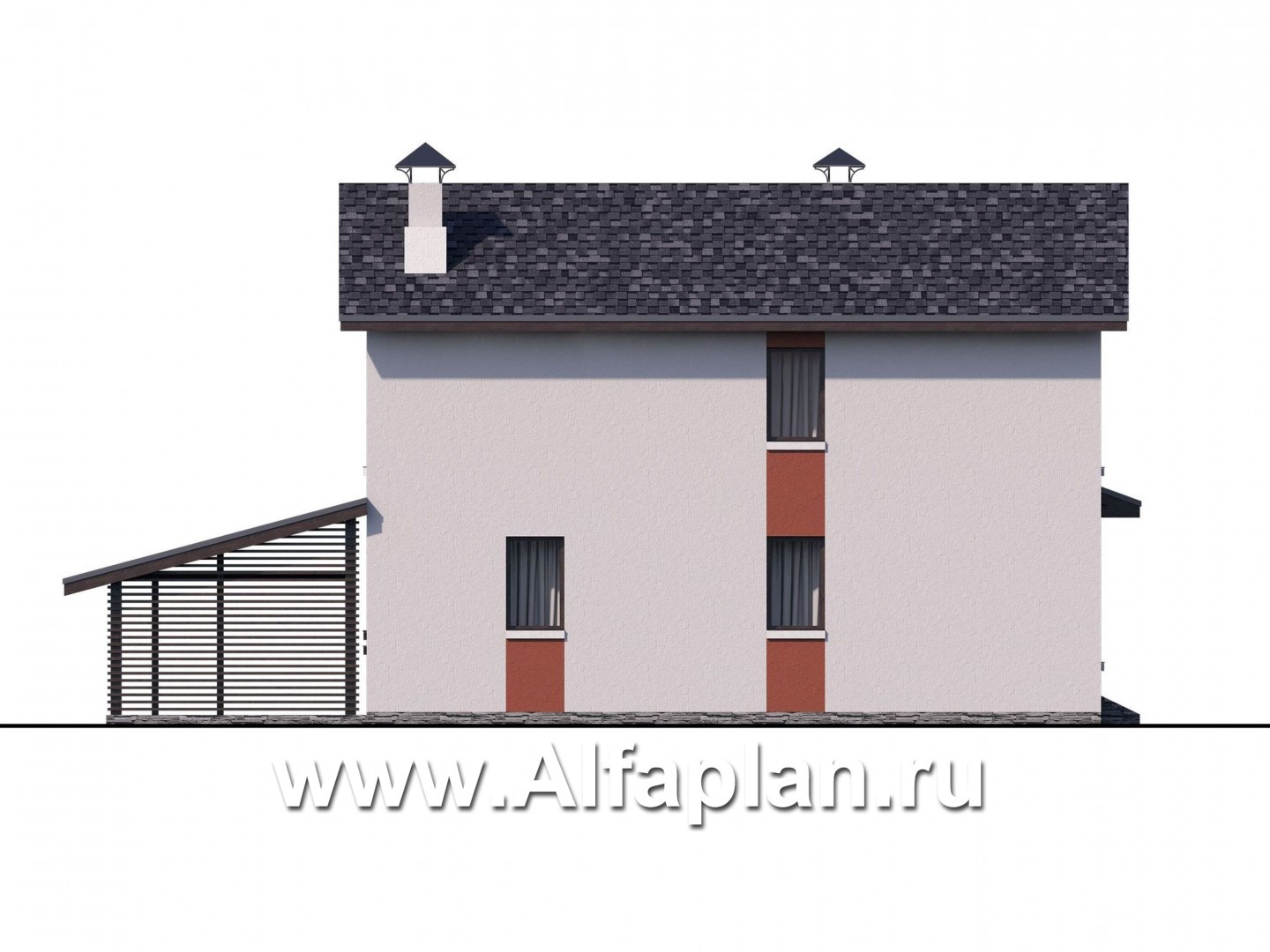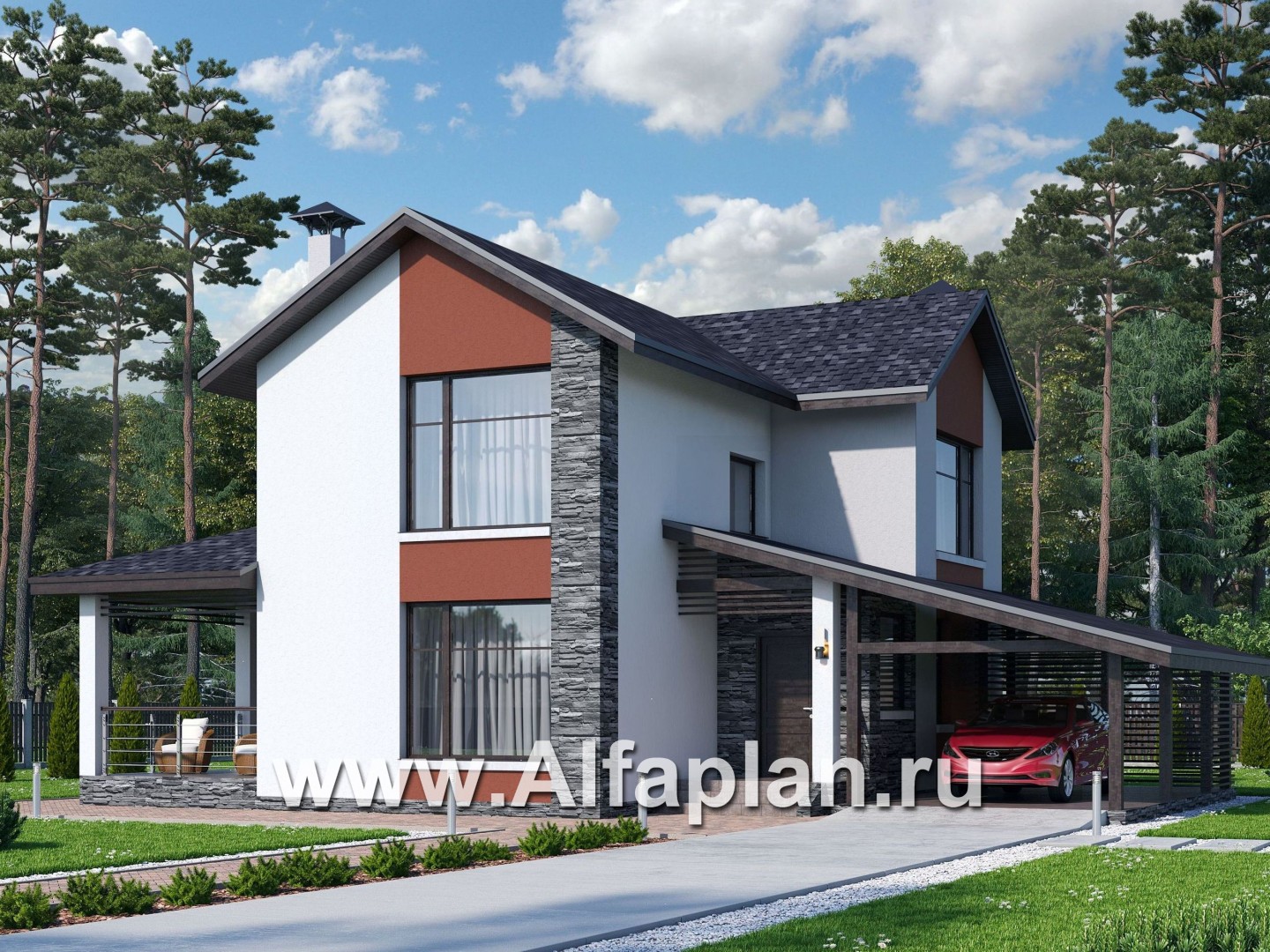 «Медиана» - проект двухэтажного дома из газобетона, с террасой и гаражом-навесом